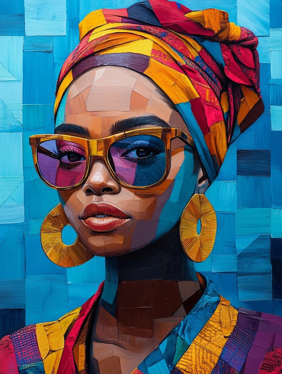 A vivid contemporary abstract portrait of an African tribal woman, geometric cubist style with bold color blocks of teal, magenta, saffron yellow, emerald green, and crimson against an azure blue background, hair styled in traditional Bantu knots with gold accents, golden earrings, clean sharp lines between color segments, high contrast, modern art painting, acrylic painting, digital art💻Le prompt du jour