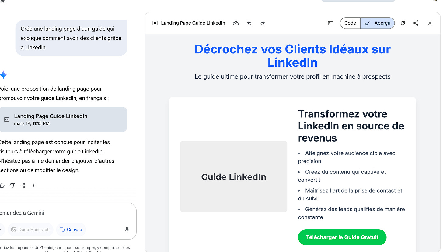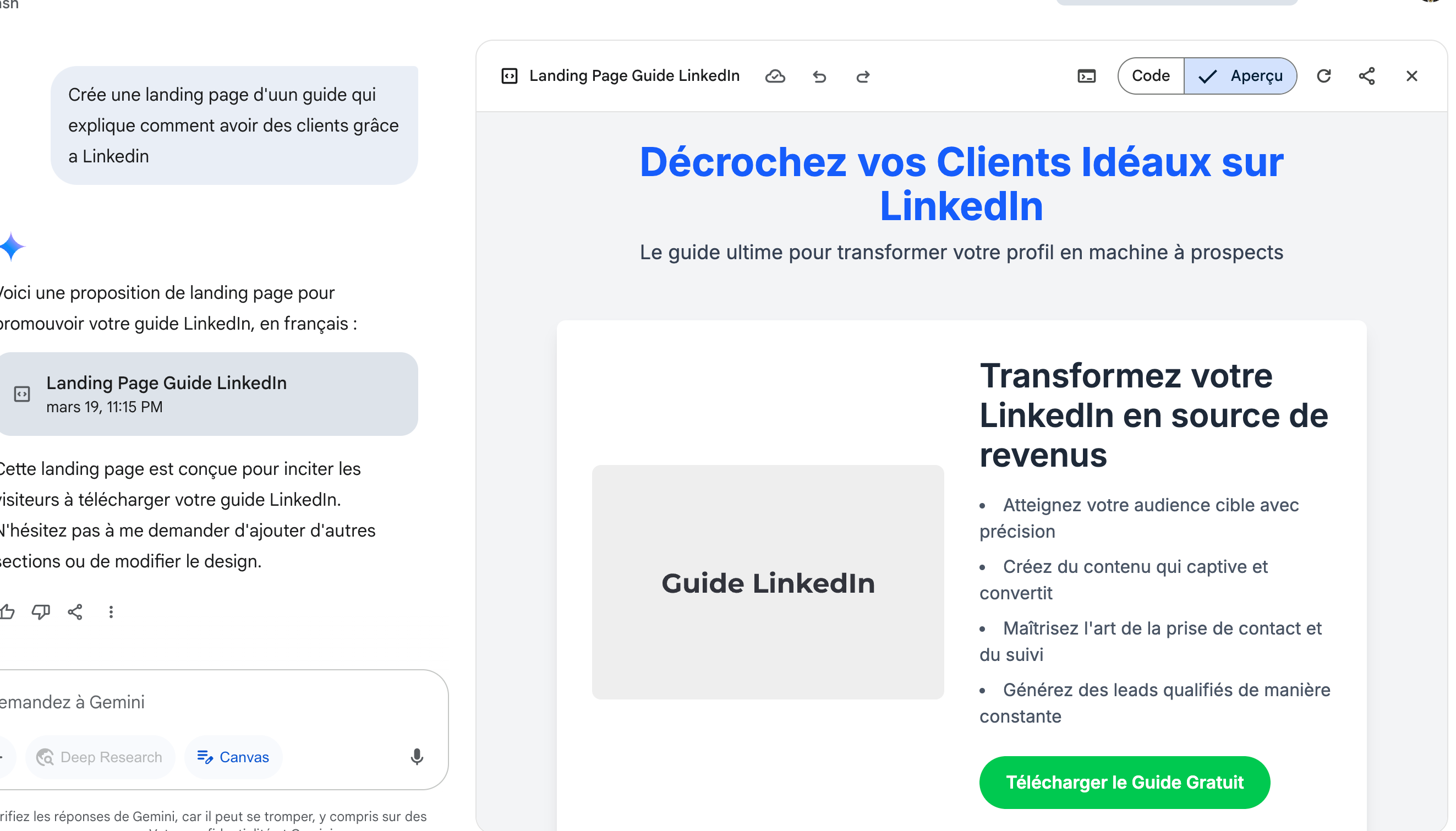 Si tu fais du code, Canvas devient un véritable allié. Il affiche une prévisualisation en direct aux côtés du code, ce qui te permet de voir instantanément les changements et d'itérer rapidement. Une fonctionnalité qui va clairement booster la productivité des développeurs !